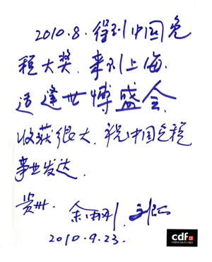 “接到中獎通知電話的時候有些以外了,有些不敢相信,不過在聽到工作人員的詳細(xì)介紹后就覺得很開心自己能夠獲得特等獎,隨后又收到了貴公司寄給我的獲獎通知及合同還有世博會門票,就覺得做的很細(xì)致,也完全相信了我確實是這么幸運(yùn)了,非常高興。”