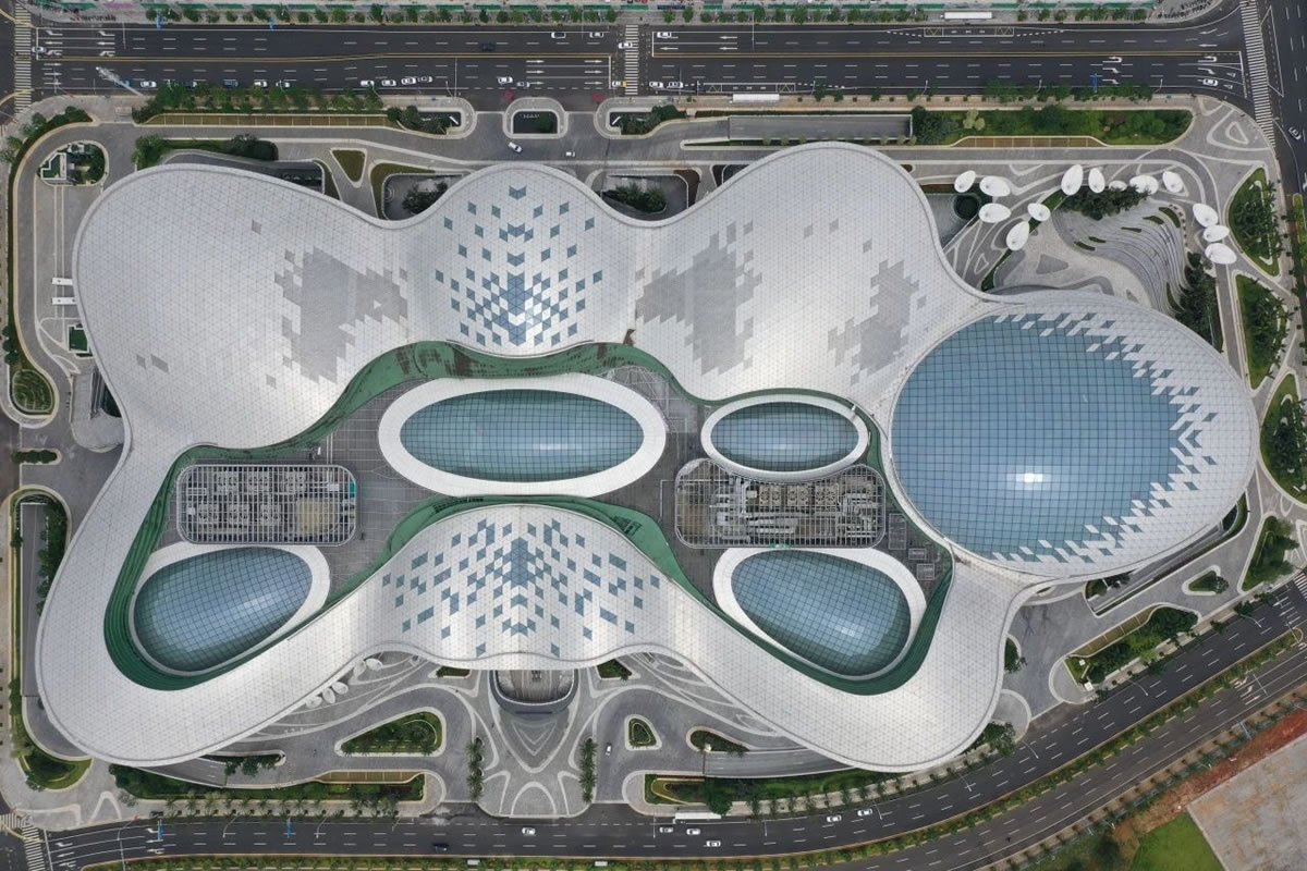 ▲??趪?guó)際免稅城項(xiàng)目“AURA天際秘林”中庭(攝于調(diào)試階段)