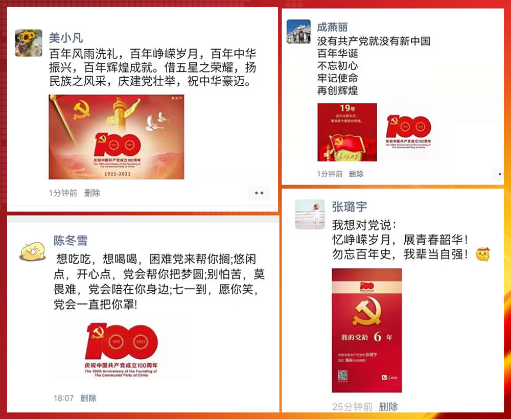 奮斗百年路,啟航新征程。為慶祝黨的百年華誕,激發(fā)黨員群眾愛(ài)黨愛(ài)國(guó)熱情,近日來(lái),公司各級(jí)黨組織、團(tuán)組織積極組織黨員和團(tuán)員青年開(kāi)展了形式多樣的主題活動(dòng),表達(dá)對(duì)中國(guó)共產(chǎn)黨的無(wú)限熱愛(ài)和對(duì)祖國(guó)的美好祝福!